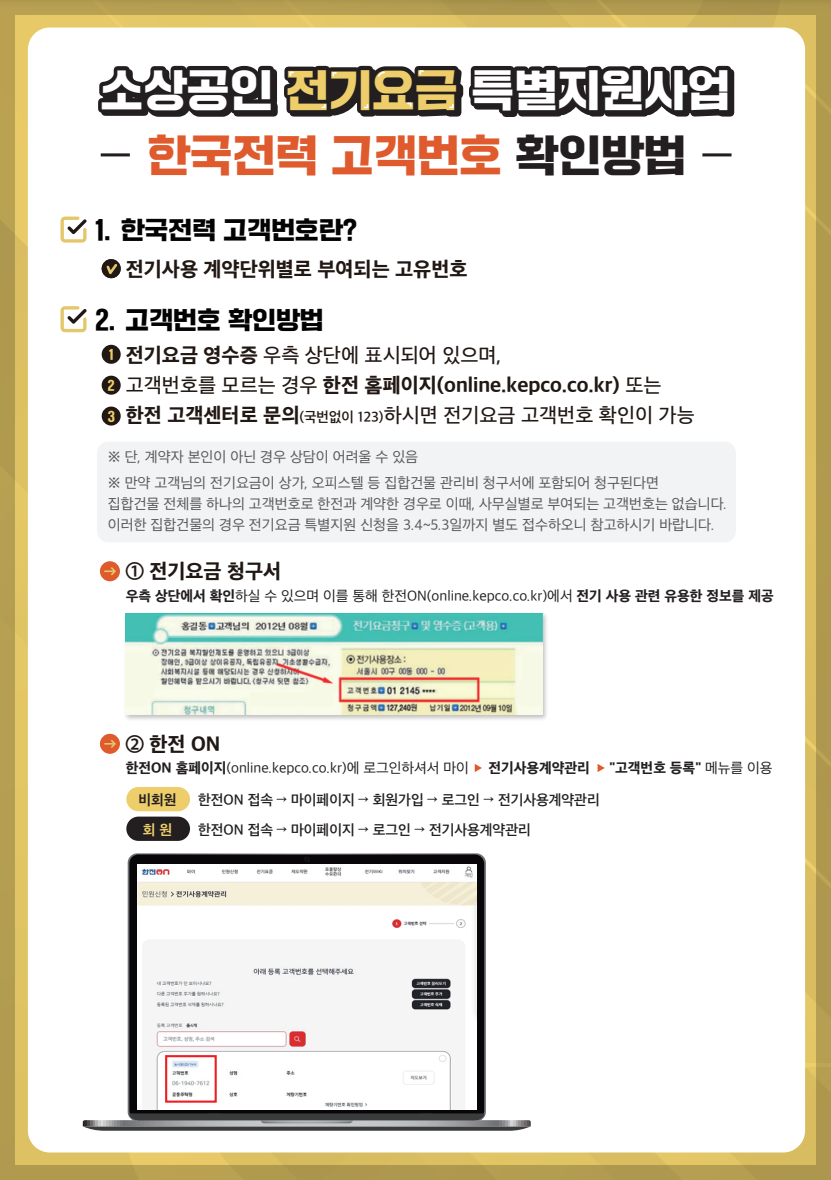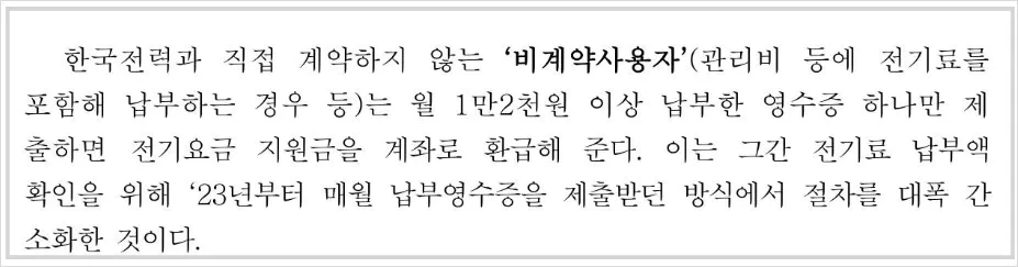 ▶ 비계약 사용자 : 월 12000원 이상 전기요금을 낸 영수증을 제출하면, 지원금을 계좌로 받을 수 있습니다.