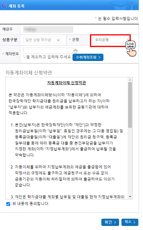 계좌등록 팝업창이 뜨면 수취계좌를 우리은행 계좌로 변경하세요.