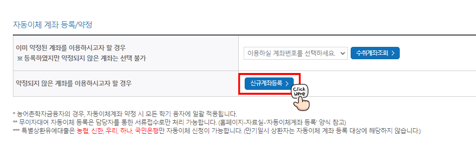 자동이체계좌 등록/약정 페이지에서 아래로 내리시면 [신규계좌등록] 버튼이 보입니다.