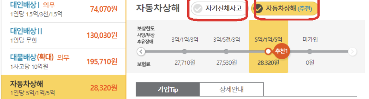 - 자동차상해 가입금액(사망/후유장해) : 1억 원, 2억 원, 3억 원, 5억 원 (부상 : 1천만 원, 2천만 원, 3천만 원, 5천만 원, 1억 원)