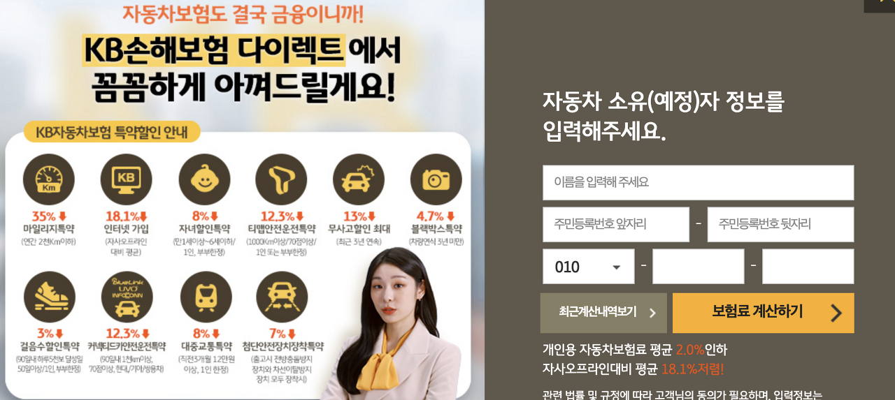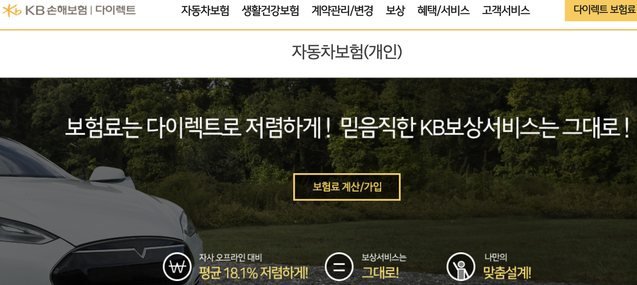 우선, 운전자분들이 가장 많이 애용하시는 국민보험인 KB 다이렉트 자동차 보험입니다. 보편적으로 보험은 개인의 상황에 따라 자신에게 더 우대이율을 받을 수 있는 보험이 있는가 하면 그 반대의 경우도 있습니다. 대부분의 사람들은 국민은행 자동차보험이 다른 보험에 비해 대략 30만 원 정도 절약이 되고 같은 조건에 싸다고 말씀하시는 경우가 많았습니다.