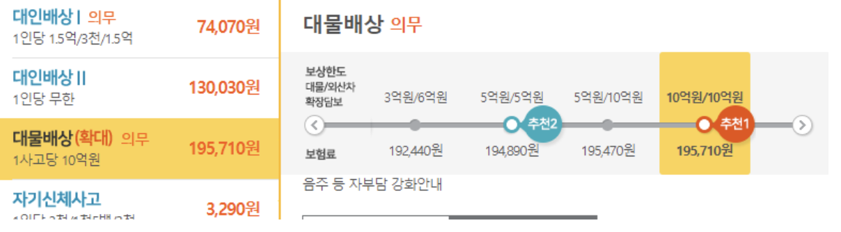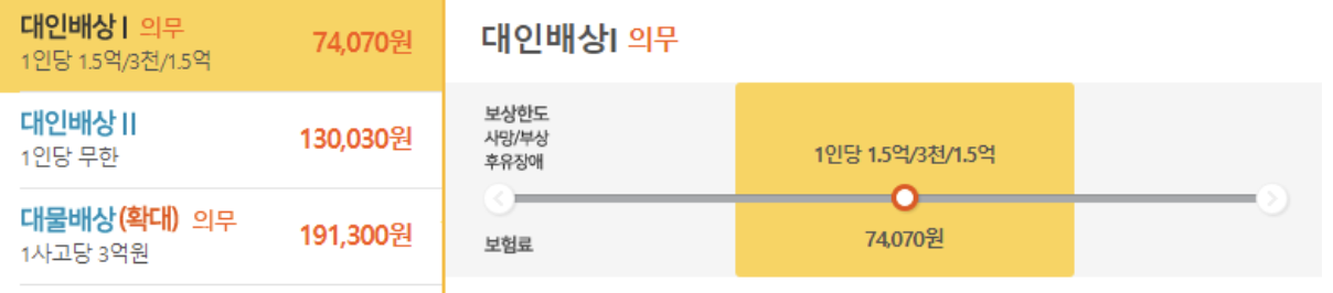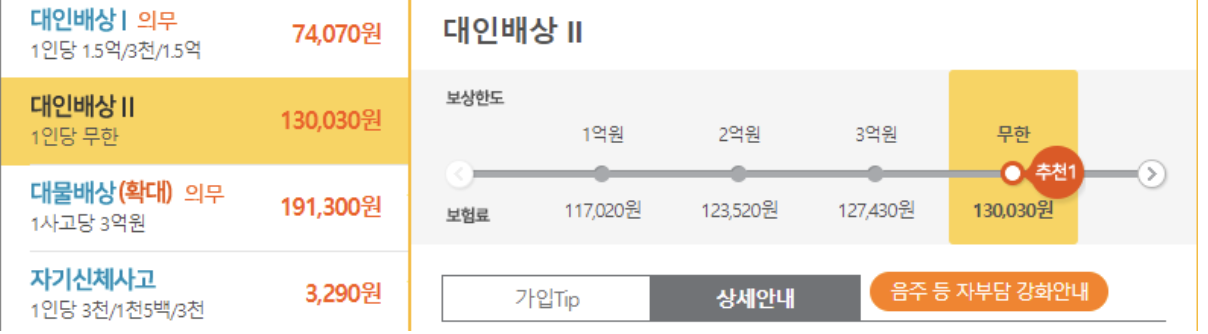 - 가입금액(대물/외산차) : 1 사고당 3천만/6천만, 5천만/1억 원, 7천만/1억 4천만 원