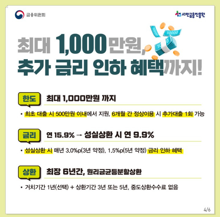 최초 대출 시 500만 원 이내에서 지원, 6개월 간 정상이용 시 추가대출 1회 가능