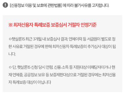 - 단 햇살론 15 신청 당시 연령 또는 신용 및 소득 등 지원대상 미해당자 거나 현재 연체 중이거나, 공공정보 보유 등 보증제한대상으로 거절된 경우에 최저신용자 특례보증 대상이 아니니 유의하시길 바랍니다.