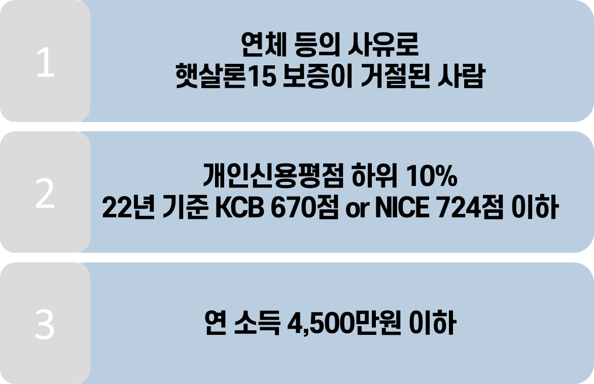 - 햇살론 15 최근 3개월 이내 보증심사 결과, 연체이력 등 서금원이 별도로 정한 사유로 거절된 경우에 한해 최저신용자 특례보증의 추가심사를 받아 볼 수 있습니다.